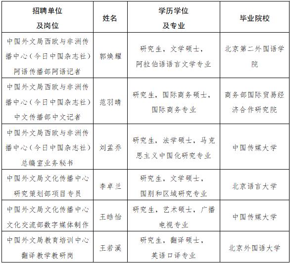 根據事業單位公開招聘工作有關規定和《中國外文局所屬企事業單位2024年度公開招聘工作人員公告》,現將中國外文局所屬中國外文局西歐與非洲傳播中心(今日中國雜誌社)等3家單位2024年度擬聘用事業單位工作人員予以公示。公示期間,如有問題,請向中國外文局反映。