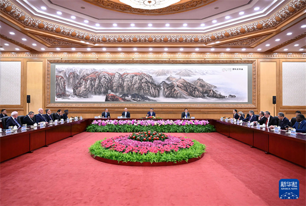10月11日上午,國家主席習近平在北京人民大會堂集體會見出席中國國際友好大會暨中國人民對外友好協會成立70周年紀念活動的外方嘉賓。(新華社記者 申宏 攝)