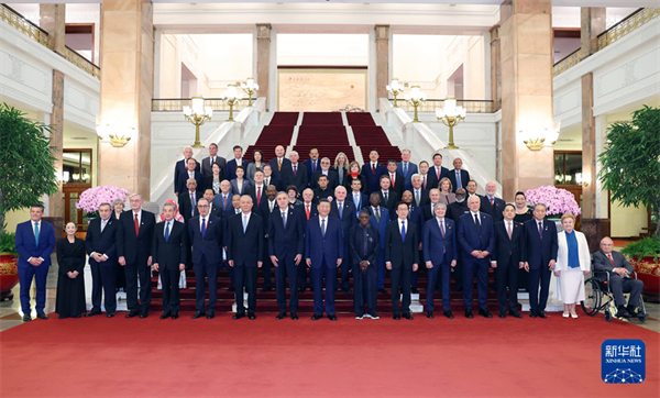 習近平首先同來華出席中國國際友好大會暨中國人民對外友好協會成立70周年紀念活動的部分外方嘉賓代表合影留念,對國際友人長期致力於對華友好事業表示高度讚賞。