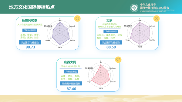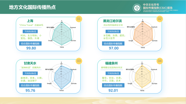 此外,報告列舉了2024年在國際上有影響力的地方文化國際傳播七個熱點,分別是:“China Travel”的最前線(上海)、用冰雪熱情感染全球(黑龍江哈爾濱)、“麻辣味道”香飄海外(甘肅天水)、蟳埔簪花綻放海外風采(福建泉州)、人與自然和諧共生的新典範(新疆阿勒泰)、中軸線申遺成功展現東方古都的文化脊梁(北京)以及千年古城的建築之美(山西大同)。