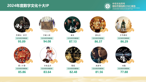 在綜合考慮文化傳播深度、文化創新性與適應性、文化影響力、受眾反饋等因素的基礎上,結合國際傳播指數模型,報告提煉出“2024年度數字文化十大IP”,依次為《黑神話:悟空》《卡遊三國》《新生》《落凡塵》《少年歌行》《第二十條》《全職高手》《繁花》《慶餘年》和《詠春》,涵蓋電影、電視劇、遊戲、潮玩、網文、動漫、舞劇等多種數字文化傳播載體。