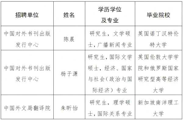根據事業單位公開招聘工作有關規定,現將我局所屬中國對外書刊出版發行中心、中國外文局翻譯院接收海外留學生予以公示。公示期間,如有問題,請向我局反映。