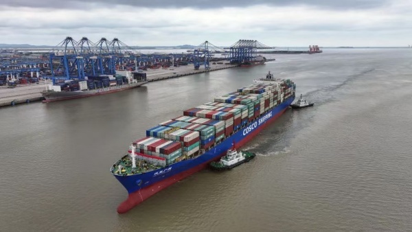 2024年5月19日,一艘海輪駛入廣西欽州港碼頭(無人機照片)。圖源:新華社