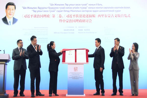 12月2日,《習近平談治國理政》第二卷、《習近平扶貧論述摘編》西裏爾蒙古文版首發式暨中蒙治國理政研討會在蒙古國首都烏蘭巴托舉行。