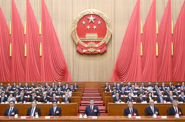 習近平、李強、王滬寧、蔡奇、丁薛祥、李希、韓正和大會主席團成員在主席台就座。