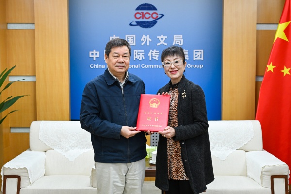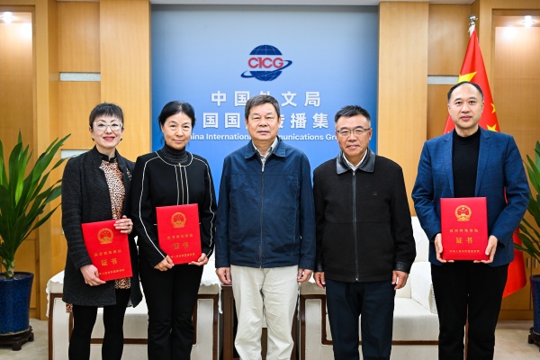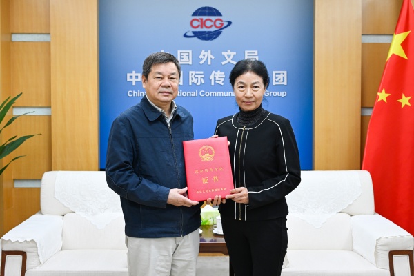 3月13日,中國外文局舉行2024年度享受政府特殊津貼專家頒獎儀式。局長杜占元為入選政府特殊津貼專家中國外文局美洲傳播中心(北京周報社)黨委書記、主任李雅芳,中國外文局所屬新星出版社黨支部書記、社長馬汝軍,中國外文局西歐與非洲傳播中心(今日中國雜誌社)英語傳播部譯審、首席定稿人孫雷頒發證書,副局長劉大為出席頒獎儀式。