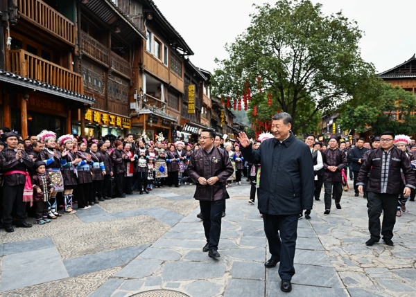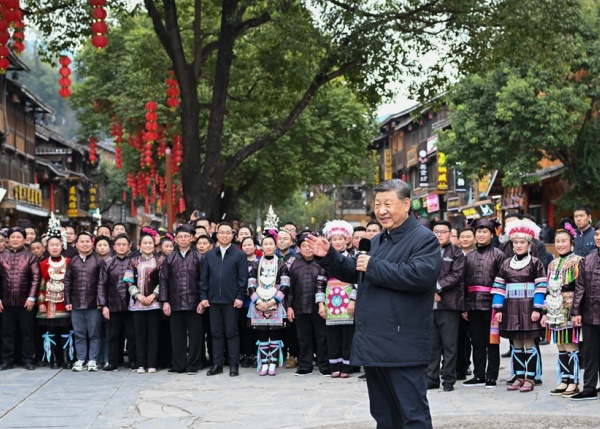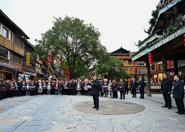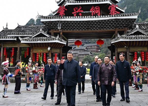 3月17日至18日,中共中央總書記、國家主席、中央軍委主席習近平在貴州考察。這是17日下午,習近平在黔東南州黎平縣肇興侗寨考察時,同村民們親切交流。(新華社記者 燕雁 攝)