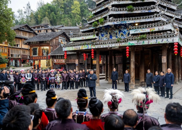 3月17日至18日,中共中央總書記、國家主席、中央軍委主席習近平在貴州考察。這是17日下午,習近平在黔東南州黎平縣肇興侗寨考察時,身著民族盛裝的村民在寨門口唱起侗族大歌歡迎總書記。(新華社記者 謝環馳 攝)