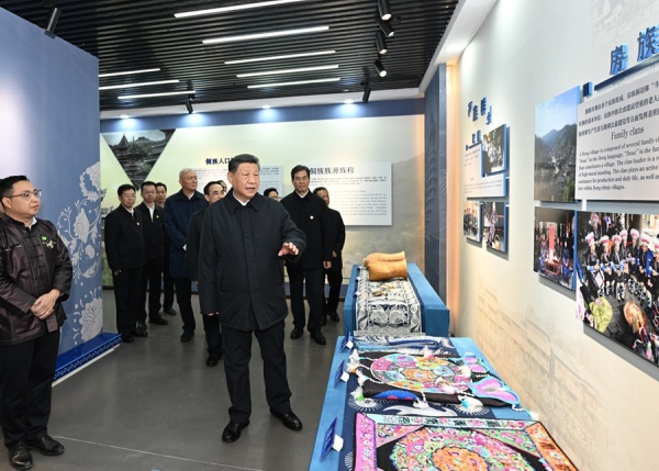 3月17日至18日,中共中央總書記、國家主席、中央軍委主席習近平在貴州考察。這是17日下午,習近平在黔東南州黎平縣肇興侗寨侗族文化展示中心考察。(新華社記者 謝環馳 攝)