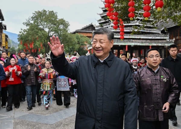 3月17日至18日,中共中央總書記、國家主席、中央軍委主席習近平在貴州考察。這是17日下午,習近平在黔東南州黎平縣肇興侗寨考察結束時,同鄉親們揮手道別。(新華社記者 謝環馳 攝)