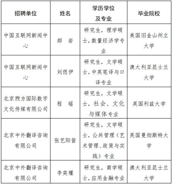 根據公開招聘工作有關規定,現將我局所屬中國互聯網新聞中心、北京煦方國際數字文化傳媒有限公司、北京中外翻譯谘詢有限公司接收海外留學生予以公示。公示期間,如有問題,請向我局反映。