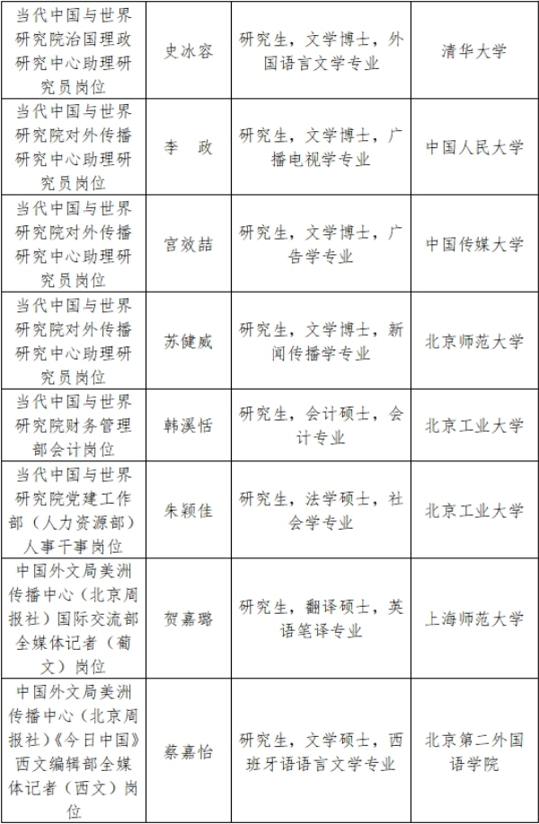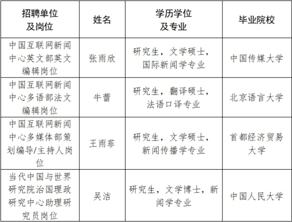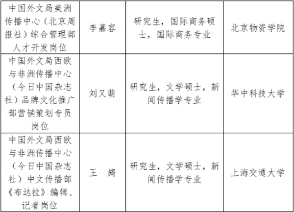 根據事業單位公開招聘工作有關規定和《中國外文出版發行事業局所屬企事業單位2025年度公開招聘工作人員公告》,現將我局所屬中國互聯網新聞中心、當代中國與世界研究院、中國外文局美洲傳播中心(北京周報社)、中國外文局西歐與非洲傳播中心(今日中國雜誌社)等4家單位2025年度擬聘用事業單位工作人員予以公示。公示期間,如有問題,請向我局反映。