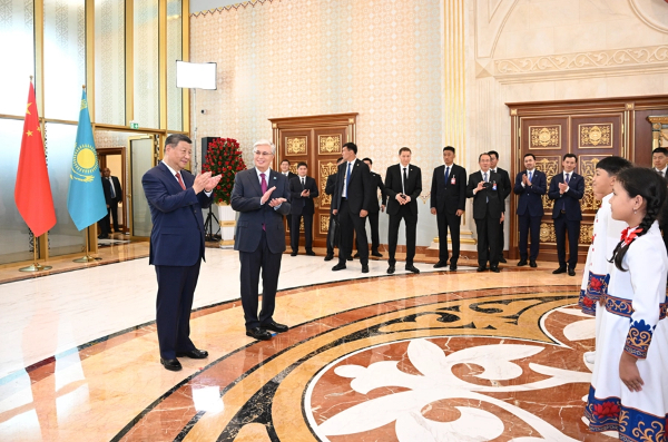 當地時間6月16日中午,國家主席習近平乘專機抵達阿斯塔納,應哈薩克斯坦共和國總統托卡耶夫邀請,出席第二屆中國—中亞峰會。這是在機場貴賓樓內,兩國元首共同欣賞哈薩克斯坦少年兒童的文藝表演。(新華社記者 謝環馳 攝)