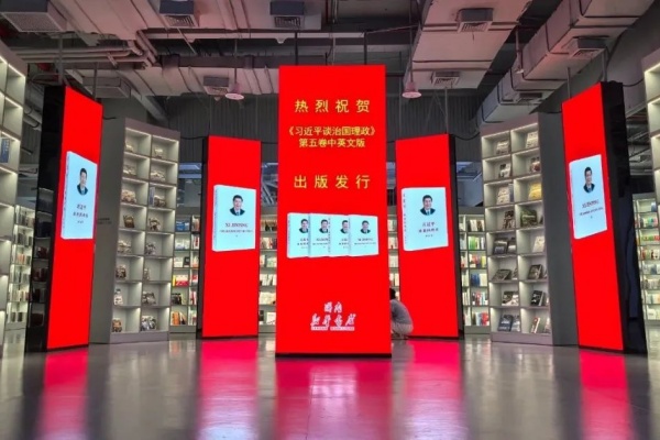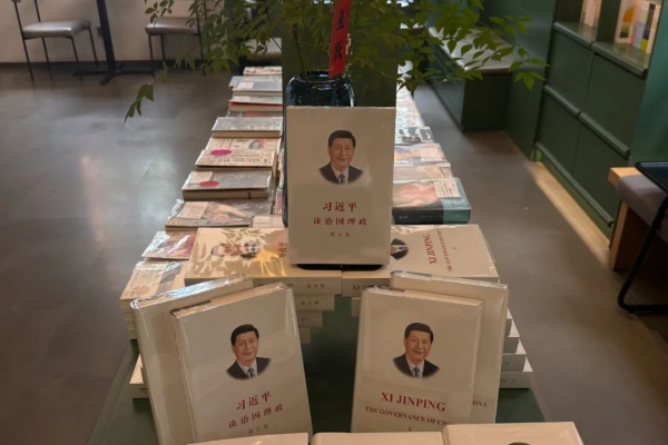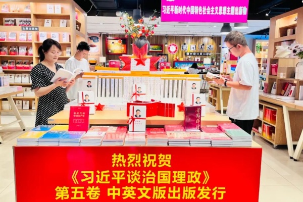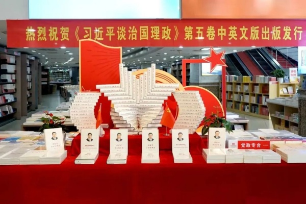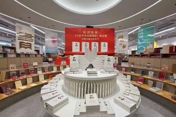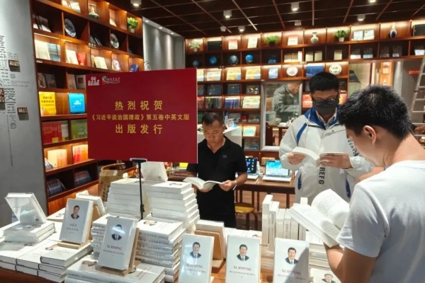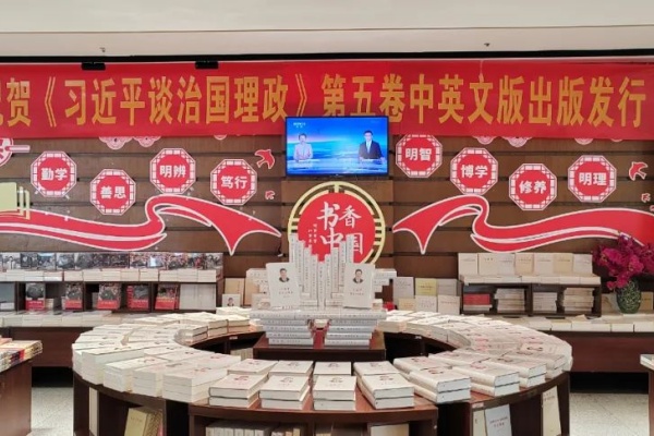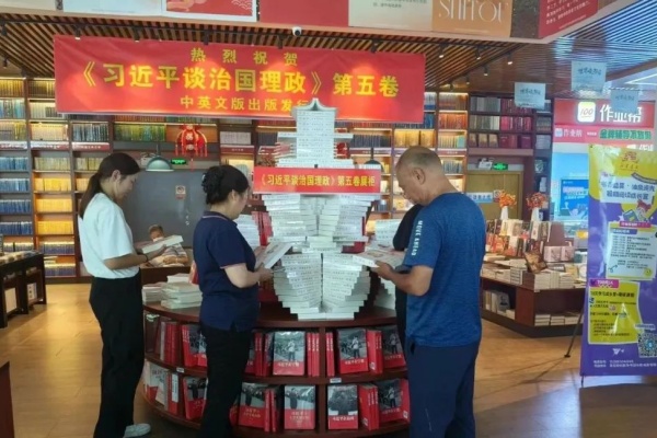 以下為《習近平談治國理政》第五卷中英文版圖書在湖南、海南、上海、天津、重慶、山東、廣西、雲南、新疆主要書店上架銷售及讀者閱讀的場麵。