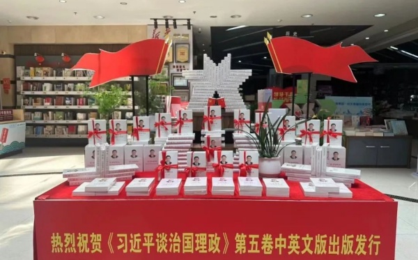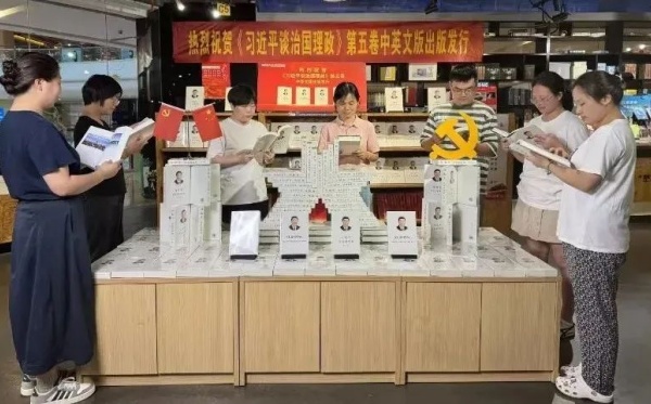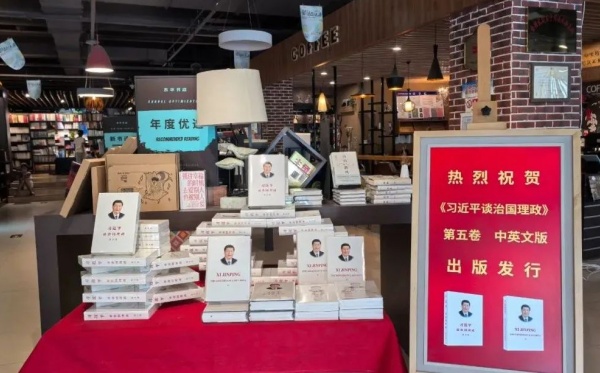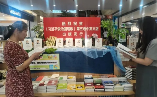 以下為《習近平談治國理政》第五卷中英文版圖書在江蘇、安徽、湖北、河南、河北、山西、江西、貴州主要書店上架銷售及讀者閱讀的場麵。