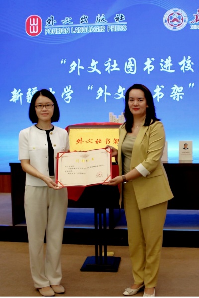 活動上,與會領導嘉賓共同為“外文社書架”揭牌,新疆大學向外文出版社贈送了“捐贈證書”。
