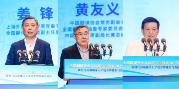 中國翻譯協會常務副會長、教指委專家委員會主任黃友義,上海外國語大學原黨委書記、教指委副主任委員薑鋒,湖南師範大學原黨委書記、教指委副主任委員蔣洪新作主旨發言。