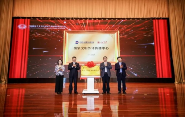 會上還舉行了儒家文明外譯傳播中心揭牌儀式。中國外文局副局長、教指委主任委員於濤,山東大學常務副校長吳臻,中國翻譯研究院副院長、教指委委員楊平和山東大學外國語學院院長、翻譯學院院長馬文共同為儒家文明外譯傳播中心揭牌。