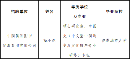 根(gen)據(ju)公(gong)開(kai)招(zhao)聘(pin)工(gong)作(zuo)有(you)關(guan)規(gui)定(ding),現(xian)將(jiang)我(wo)局(ju)所(suo)屬(shu)中(zhong)國(guo)國(guo)際(ji)圖(tu)書(shu)貿(mao)易(yi)集(ji)團(tuan)有(you)限(xian)公(gong)司(si)接(jie)收(shou)海(hai)外(wai)留(liu)學(xue)生(sheng)予(yu)以(yi)公(gong)示(shi)。公(gong)示(shi)期(qi)間(jian),如(ru)有(you)問(wen)題(ti),請(qing)向(xiang)我(wo)局(ju)反(fan)映(ying)。