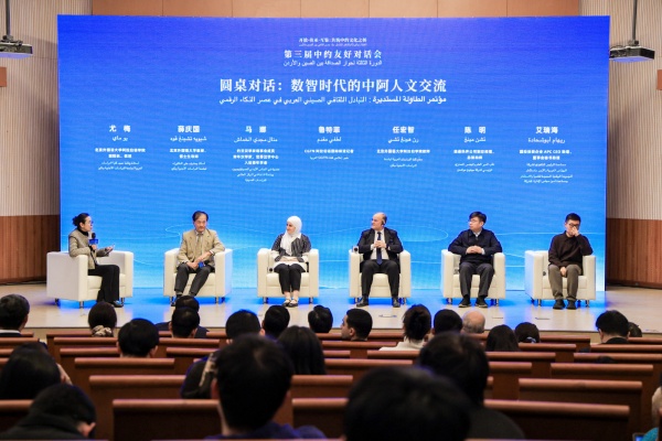 在圓桌對話環節,北京外國語大學阿拉伯學院副院長、教授尤梅,北京外國語大學教授、博士生導師薛慶國,約旦漢學家理事會成員、青年漢學家馬娜·阿卜杜拉-迪夫·卡瑪什,CGTN阿拉伯語國際頻道記者魯特菲(阿爾及利亞籍),北京外國語大學阿拉伯語學院教師任宏智,捷通華聲公司副總經理、總架構師陳明,國投投資企業APC CEO助理、董事會秘書助理艾瑞海等中外嘉賓,圍繞“數智時代的中阿人文交流”這一主題進行深入探討,分享了他們借助新技術、新平台,開展中約、中阿人文交流工作的實踐成果與思考。
