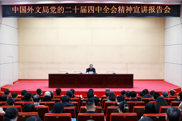 11月27日,中國外文局舉行黨的二十屆四中全會精神宣講報告會,深入學習貫徹全會精神,全麵部署學習宣傳貫徹工作。局長常勃以《深學篤行黨的二十屆四中全會精神,全力推動世界一流國際傳播機構建設取得新成效》為題,集中宣講黨的二十屆四中全會精神,並為全局黨員幹部講授專題黨課。副局長於濤、餘應福出席會議。