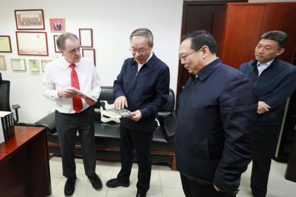 俞家棟(左二)和常勃(左三)在大衛·弗格森(左一)的工作場所了解工作情況