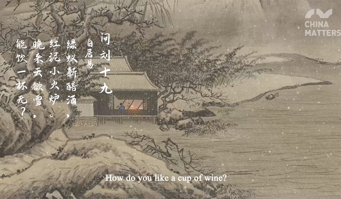 白居易《問劉十九》和南宋畫家夏圭的《雪堂客畫圖》相結合,讓人忍不住向往那白雪飄飄、擁火對飲的夜晚。
